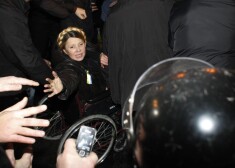 Jūlijas Timošenko augstie apavi, uzrunu tautai sakot no ratiņkrēsla