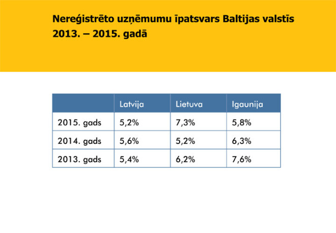 Statistikas dati liecina: ja 2013. gadā aplokšņu algu apjoms bija 25,2%, tad pērnā gada nogalē tas bija tikai 17,9% Tāpat arī krities nereģistrēto uzņēmumu skaits - ja 2014. gadā to bija 5,6%, tad pērn 5,2% no visiem valstī strādājošiem uzņēmumiem.