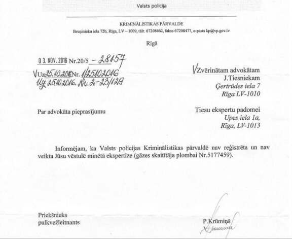 Taču, komunicējot ar advokātu Jāni Tiesnieku, izkristalizējas virkne patiesi interesantu ziņu par pašu tiesu ekspertu, kurš pārbaudījis noņemtā "Latvijas Gāzes" skaitītāja plombu - Ivaško. Proti, šai gāzes skaitītāja plombai (Nr.5177459) veiktā ekspertīze nav bijusi reģistrēta Valsts policijas Kriminālistikas pārvaldē. To advokātam Tiesniekam vēstulē apliecinājusi pati pārvalde (skatīt zemāk):