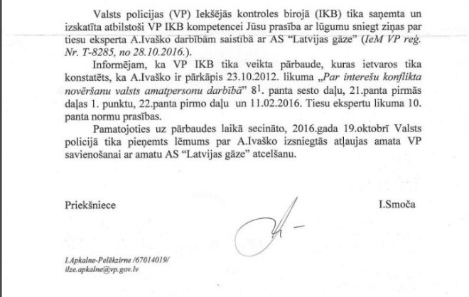 Kā redzams, pamatojoties uz pārbaudes laikā secināto, 2016.gada 19.oktobrī Valsts policijā tika pieņemts lēmums par A.Ivaško izsniegtās atļaujas amata Valsts policijā savienošanai ar amatu "Latvijas Gāzē" atcelšanu.