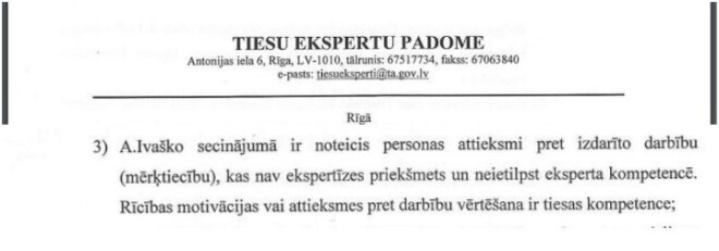 Savukārt tiesu eksperta rīcībā iezīmējas "skriešana" pa priekšu tiesas darbībām – Tiesu ekspertu padome vēstulē advokātam Jānim Tiesniekam norāda, ka A.Ivaško savā eksperta atzinumā "ir noteicis personas attieksmi pret izdarīto darbību (mērķtiecību, skatīt attēlu nr.1) kas nav ekspertīzes priekšmets un neietilpst eksperta kompetencē". Tiesu ekspertu padome vēstulē skaidro, ka "rīcības motivācijas vai attieksmes pret darbību vērtēšana ir tiesas kompetence" (skatīt zemāk):