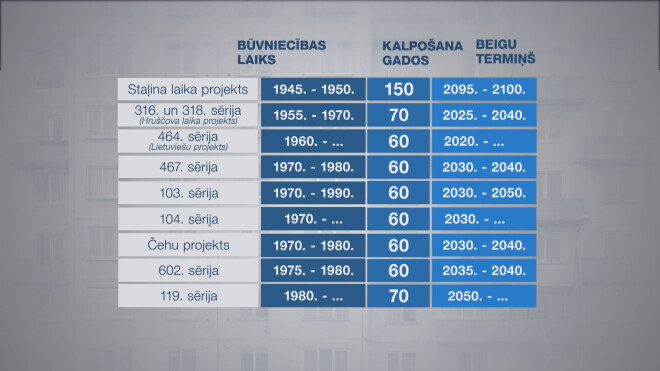 Ministru kabineta noteikumi nosaka, ka padomju laikā būvēto sērijveida daudzdzīvokļu namu indikatīvais kalpošanas ilgums ir vidēji 60 gadi (103., 104., 467., 602. sērija, čehu projekts). Hruščova laika vecākajām mājām beigu termiņš pēc nepilniem 6 gadiem. Tas, ka pienāk normatīvā kalpošanas laika beigas, nenozīmē automātisku avārijas stāvokli un liegumu cilvēkiem tur dzīvot. Tas ir brīdis, kad dzīvokļu īpašniekiem ir obligāti jāpasūta būvinženiera padziļinātā tehniskā ekspertīze.