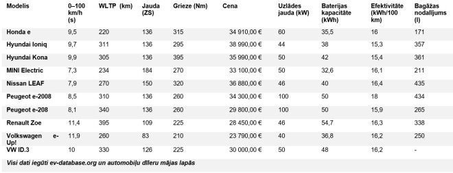 Salīdzināmo elektroauto desmitnieks ir šāds: Honda e, Hyundai Ioniq, Hyundai Kona Electric, MINI Electric, Nissan LEAF, Peugeot e-2008, Peugeot e-208, Renault Zoe, Volkswagen e-Up! un Volkswagen ID.3. Dažiem no modeļiem ražotāji piedāvā vairākas versijas, tai skaitā beterijas un elektromotoru izvēles iespējas, tādēļ salīdzinājumā ietverti lētākie bāzes modeļi.