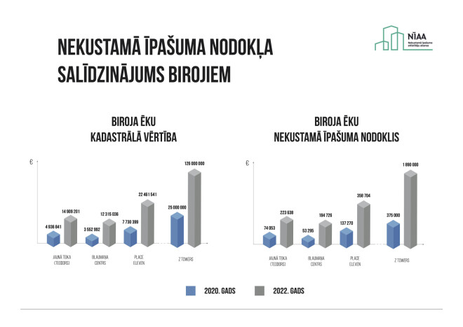 Atbilstoši NĪAA datiem, pēdējo desmit gadu laikā Rīgā ir uzbūvēti 200 tūkstoši kvadrātmetri biroju platību, bet tikmēr Viļņā – turpat 500 tūkstoši kvadrātmetri jaunu biroju telpu. Biroju ēku attīstība, kas vienlaikus atbalstītu starptautisko biznesa pakalpojumu centru attīstību Latvijā, ir viens no atslēgas faktoriem, kas var sekmēt valsts attīstību. Tāpēc NĪAA ieskatā NĪN nepalielināšana komerciālajām platībām ir minimālā programma, kas nepieciešama turpmākai nekustamā īpašuma nozares attīstībai.
