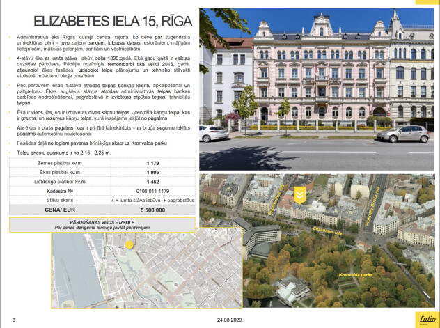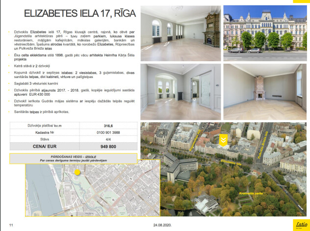 Elizabetes ielā 17 – 8, Rīgā, bankai pieder grezns dzīvoklis 313,5 m2 platībā. Nekustamā īpašuma indikatīvā sākumcena kā norāda “Latio”, ir 949 800 eiro (cenu aptaujas cena netiek aplikta ar PVN).