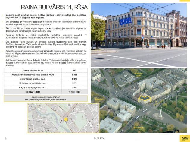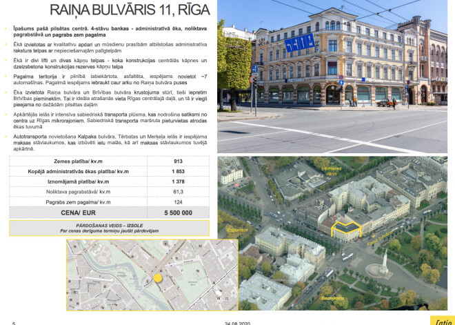 Ēka izvietota Raiņa bulvāra un Brīvības bulvāra krustojuma stūrī, tieši iepretim Brīvības piemineklim. Indikatīvā sākuma cena – 5,5 miljoni eiro.