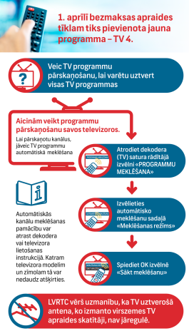 Līdz ar jaunas TV programmas "TV4" pievienošanu virszemes TV apraides tīklam, iedzīvotājiem, kuri skatās bezmaksas un maksas virszemes apraidē esošās programmas, 1.aprīlī nepieciešams veikt TV programmu pārskaņošanu savu televizoru uztvērējos, portālu Jauns.lv informē VAS "Latvijas Valsts radio un televīzijas centrs" (LVRTC), kas nodrošina bezmaksas apraidē esošo programmu izplatīšanu valstī.