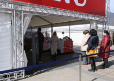 Cilvēki iepērkas improvizētā tirdziņā pie "Domina"