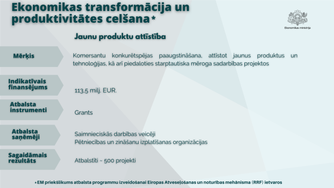 * Grants jauniem produktiem un pakalpojumiem – 30 miljoni eiro (atbalsta saņēmējs – komersanti).