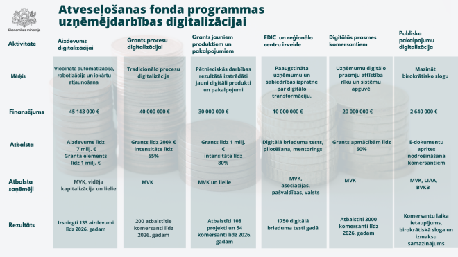 * Grants procesu digitalizācijai – 40 miljoni eiro (atbalsta saņēmējs – komersanti).