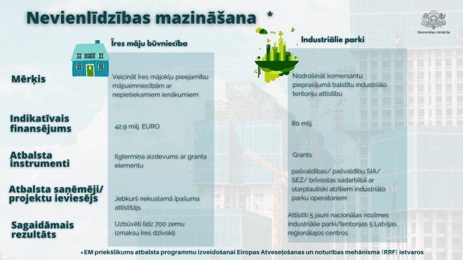 * Īres mājokļu pieejamība mājsaimniecībām ar nepietiekamiem ienākumiem (ilgtermiņa aizdevums ar granta elementu) – 42,9 miljoni eiro (atbalsta saņēmēji – jebkurš nekustamā īpašuma attīstītājs).