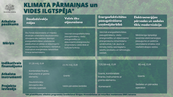 * Energoefektivitātes paaugstināšana uzņēmējdarbībā – 120,59 miljoni eiro (atbalsta saņēmējs – komersanti).