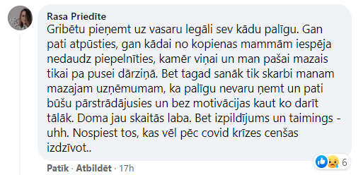 Rasa Priedīte: “Gribētu pieņemt uz vasaru legāli sev kādu palīgu. Gan pati atpūsties, gan kādai no kopienas mammām iespēja nedaudz piepelnīties, kamēr viņai un man pašai mazais tikai pa pusei dārziņā. Bet tagad sanāk tik skarbi manam mazajam uzņēmumam, ka palīgu nevaru ņemt un pati būšu pārstrādājusies un bez motivācijas kaut ko darīt tālāk. Doma jau skaitās laba. Bet izpildījums un taimings - uhh. Nospiest tos, kas vēl pēc covid krīzes cenšas izdzīvot”.