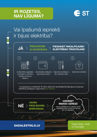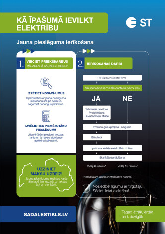 Plašāka informācija par jauna pieslēguma ierīkošanu, ietverot nepieciešamos darbus soli pa solim, pieejama "Sadales tīkla" mājaslapā.