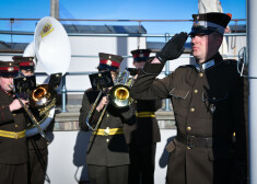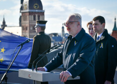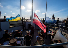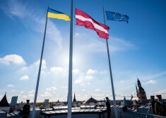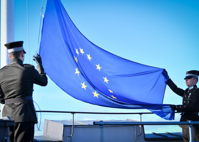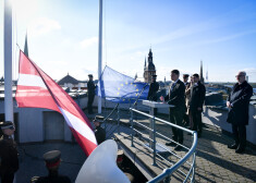 Rīgas pils tornī līdzās Latvijas karogam plīvo arī Ukrainas un Eiropas Savienības simboli