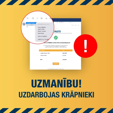"Brīdinām, ka krāpnieki izsūta e-pastus, kuros aicina apmaksāt "Latvijas Pasta" kurjerpakalpojumus. Aicinām būt uzmanīgiem un vienmēr pārbaudīt sūtītāja e-pasta adresi. "Latvijas Pasta" e-pasti vienmēr beidzas ar @pasts.lv," tiek vēstīts paziņojumā.