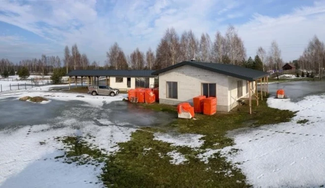 Zemāk attēlā redzams, kā īpašums izskatās ziemas/pavasara laikā, kad tajā, sniegam kūstot un nokrišņu rezultātā, ir ļoti augsts mitruma līmenis un veidojas peļķes.