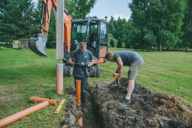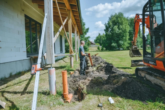 1. Līdzīgi kā vairumā šāda tipa objektu pirmais solis ir notekūdeņu sistēmas izbūve. Konkrētā objekta gadījumā tā aptver abu ēku apkārtējos perimetrus. Darbu veikšanai tika izmantots mini eskavators ar 60cm kausu, ar kuru tika sagatavotas tranšejas (parasti ap 40-60cm dziļas) priekš 110mm PVC lietus notekūdeņu caurulēm. Atkarībā no īpašuma platības, ēkas sienu plānojuma, reljefa u.c. faktoriem, šādas caurules lielākoties pieejamas 1m, 2m un 3m garumā. Papildus, protams, jāparedz arī dažāda tipa savienojumi (T veida, 45 vai 90 grādu u.c.), lai pieslēgtos pie pārējām sistēmām.