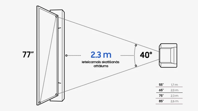 Pirmais, ko uzreiz saproti – tas ir liels. Patiešām liels televizors, jo OLED ekrānu 77 collu izmērā bieži negadās redzēt. Te uzreiz var rasties jautājums – vai tik lielam televizoram vispār pietiek vietas vidusmēra dzīvoklī? Steidzam nomierināt visus satrauktos prātus – pietiek gan! Nav vairs tie laiki, kad no televizora vajadzēja sēdēt vismaz trīs metru attālumā, jo citādi varēja saskatīt katru atsevišķu pikseli. Tagad attēla kvalitāte ir tādā līmenī, ka pat no ļoti tuvas distances pikseļus saskatīt būs grūti, un, lai gūtu maksimālu izjūtu gammu, ir pat vēlams sēdēt televizoram diezgan tuvu, bet tas savukārt nozīmē, ka nav nepieciešama liela telpa. Samsung pat ir aprēķinājuši, kāds ir ideālais skatīšanās attālums dažādu izmēru televizoriem: 55 collu ekrānam tas ir 1,7 metri, 65 collām – 2 metri, 75 collām – 2,3 metri, bet 85 collu milzenim – 2,6 metri. Tātad, kā redzam, attālums nav liels un ļoti plašu telpu neprasa.