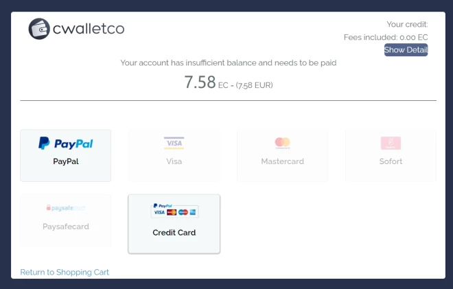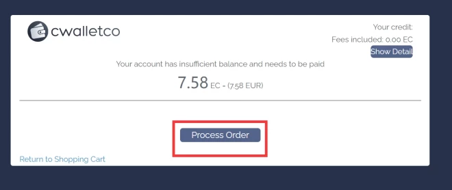 - Cilnē “Payment Information” pēc noklusējuma tiks parādīta tikai opcija Cwalletco — noklikšķiniet uz Turpināt.