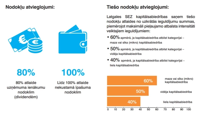 Latgales SEZ kapitālsabiedrības saņem tiešo nodokļu atlaides no uzkrātās ieguldījumu summas, piemērojot maksimāli pieļaujamo atbalsta intensitāti veiktajiem ieguldījumiem: