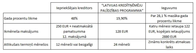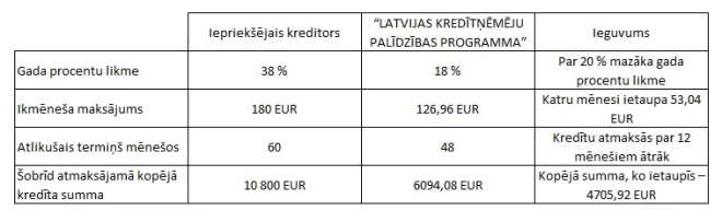 Meklējot risinājumu, viņš vērsās pie “LATVIJAS KREDĪTŅĒMĒJU PALĪDZĪBAS PROGRAMMA”. Zinoši speciālisti uzklausīja Niklāva bēdu stāstu un piedāvāja viņam izdevīgi pārkreditēt kredītlīniju. Niklāvam piedāvājums patika, un viņš parakstīja jaunu līgumu par aizdevumu ar 18 % gada likmi, kas jāapmaksā 48 mēnešu laikā, katru mēnesi maksājot 126,96 eiro. Pateicoties “LATVIJAS KREDĪTŅĒMĒJU PALĪDZĪBAS PROGRAMMA”, Niklāvs katru mēnesi ietaupa 53,04 eiro, bet kopumā uz visu kredīta atmaksu ievērojamu summu – 4705,92 eiro, kurus viņš nolēmis tērēt jaunas automašīnas iegādei.