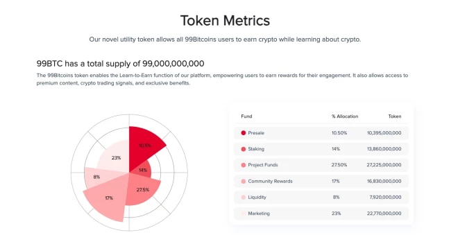 $99BTC kalpos kā lietderības žetons 99Bitcoins galvenajā platformā “Learn-to-Earn”, kas cenšas panākt masveida ieviešanu, izmantojot kriptovalūtu stimulus un sarežģītu tokenomiku.