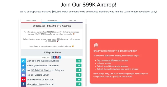 Pašlaik karstākais kriptovalūtu airdrop, kurā ieguldīt ir 99Bitcoins, piedāvājot dalībniekiem 99 999 ASV dolāru vērtībā BTC visā kampaņas laikā.