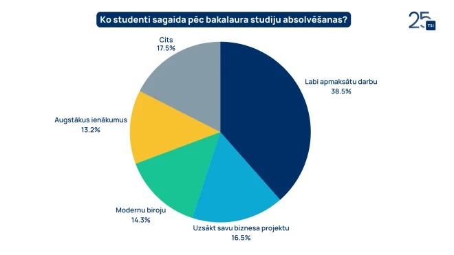 Ikgadējā bakalaura studentu aptaujā kopumā izvirzījušās 3 lietas, ko atklāj TSI studenti. Lielākā daļa respondentu (51,8 %) domā par nodrošināto nākotni - atrast labi apmaksātu darbu, kur var pielietot savas prasmes un zināšanas, kas ļaus palielināt ienākumus. Ikvienam studentam ir svarīga finansiālā drošība un viņi vēlas atrast darbu, kas ļaus viņiem atbilstoši atalgot savas prasmes un zināšanas. Nereti tieši šī iemesla dēļ par savu nākotnes profesiju izvēlas tieši tehniskās zinātnes, piemēram, tādas programmas kā “Datorzinātnes”, “Mākslīgais intelekts” vai “Robotika”. Jāpiebilst, ka IT speciālisti joprojām darba tirgū ir augsti pieprasīti, novērtēti un arī labi atalgoti. Popularitātes ziņā neatpaliek arī “Uzņēmējdarbība un vadība”. Tieši šī programma vispusīgi sagatavo jaunos līderus un vadītājus, kas spēj loģiski, stratēģiski un pārdomāti vadīt procesus dažādu jomu uzņēmumos.