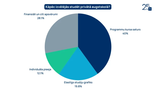 Nereti skolēni, nonākot izvēles priekšā, nespēj izlemt, kādā augstākās izglītības iestādē studēt – privātajā vai valsts. TSI bakalaura studenti kā galveno iemeslu, kāpēc izvēle bija par labu privātajai augstskolai, min savas studiju programmas kursu saturu (40%). Tas liecina, ka studentiem ir svarīga kvalitatīva izglītība un iespēja apgūt prasmes un zināšanas, kas ir pieprasītas darba tirgū. Tajā pašā laikā viņiem ir svarīgi apgūt tādus priekšmetus, kas ir praktiski, noderīgi un pielietojami ikdienā savā esošajā vai nākotnes darba vietā. “Robotikas” bakalaura programmas 4. kursa students Mihails Pliners dalās savās pārdomās: “Izvēlējos TSI, jo tad, kad meklēju augstskolu, tā bija vienīgā, kas piedāvāja apgūt tieši industriālo robotiku. Un arī iespēju iegūt ārvalstu prakses pieredzi. Man plāns pēc absolvēšanas būtu šāds: visas zināšanas, kuras esmu apguvis šeit, pielietot, strādājot tieši šajā jomā. Kā students es šeit nejūtos viens, jo TSI ir kā liela ģimene, kurā ikviens var palīdzēt, kā arī nav tāda jautājuma, uz kuru nevar atrast atbildi. Iesaku studēt TSI, jo, manuprāt, šī ir vislabākā augstskola Latvijā, kurā ir lieliskas laboratorijas, pieredzējuši vietējie un ārvalstu pasniedzēji, kas dalās savā pieredzē.”