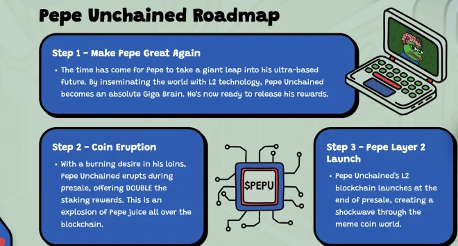 Tomēr Pepe Unchained ir vairāk nekā tikai mēmu monētu, tā ir pilnīga mēmu monētu ekosistēma. Tā ietver arī 2. slāņa blokķēdi, kas atvieglo tūlītējus darījumus par zemām cenām, vienlaikus piedāvājot milzīgu ieguvuma potenciālu.