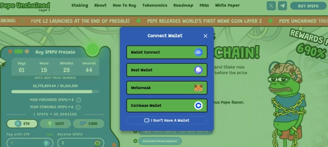 Dodieties uz oficiālo Pepe Unchained iepriekšpārdošanas vietni. Noklikšķiniet uz opcijas “Savienot maku”, un parādīsies vairāki maku nodrošinātāji. Izvēlieties savu maku.