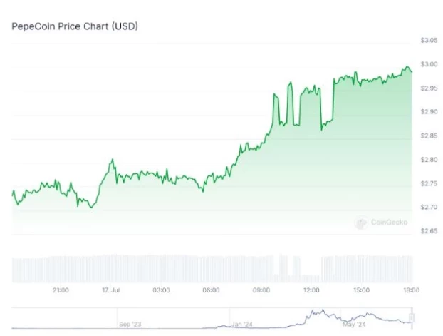 Šis kāpums bija diezgan liels pavērsiens, ņemot vērā, ka $PEPE pirmdien bija mēmu monētu līderis pēc tam, kad riska kapitāla uzņēmums Nascent ieguldīja 3,41 miljonu ASV dolāru, lai iegūtu 141 miljardu $PEPE žetonu.