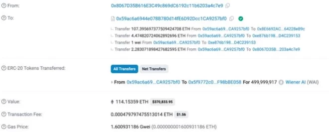 Šis Bitcoin radītais impulss izraisīja 1,8% pieaugumu visā tirgū. Tomēr īstais nedēļas nogales notikums bija kāds valis, kurš nonāca virsrakstos, ieguldot 114,15 ETH WienerAI iepriekšpārdošanā, nopērkot gandrīz 500 miljonus $WAI.