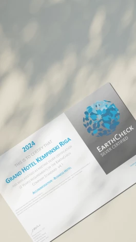 Grand Hotel Kempinski Rīga svin nozīmīgu notikumu, iegūstot EarthCheck Sudraba Sertifikātu. EarthCheck ir vadošā pasaules biznesa konsultāciju grupa, kas specializējas uz ilgtspējību un galamērķu pārvaldību tūrisma un ceļojumu industrijā.
