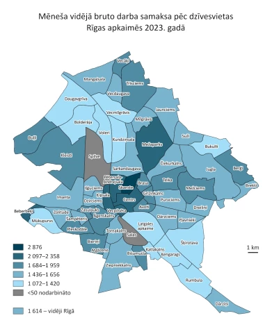 2023. gadā vislielākā mēneša vidējā bruto darba samaksa, skatoties pēc dzīvesvietas, bija Skanstē – 2 876, Ķīpsalā – 2 358 un Vecpilsētā – 2 262 eiro mēnesī. Saskaņā ar šiem datiem Rīgā mēneša vidējā bruto darba samaksa pērn bija 1 614 eiro mēnesī, un virs vidējās saņēma iedzīvotāji 26, zem vidējās – 32 Rīgas apkaimēs.