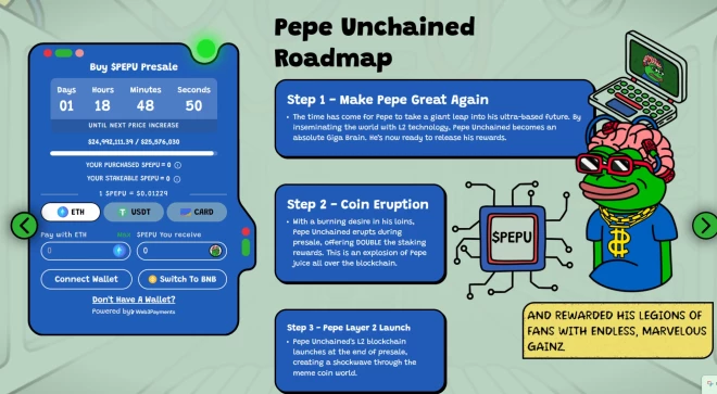 Pepe Unchained ir Pepe mēma pārveidošana, ko nodrošina modernākā 2. līmeņa blokķēdes tehnoloģija. Šis ERC-20 žetons piedāvā divkāršotu ieguldījumu atlīdzību un zibenīgu darījumu ātrumu, padarot to par populāru izvēli pašreizējā kriptovalūtas trakuma apstākļos.