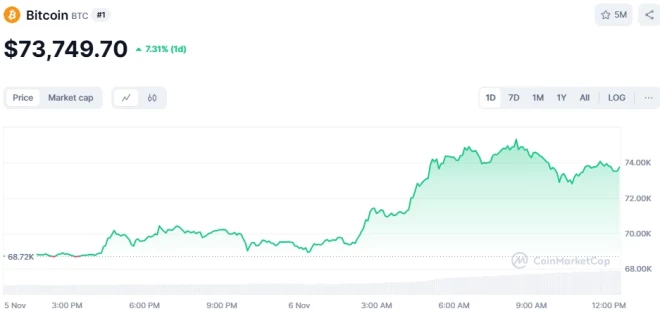 Donalda Trampa uzvara vēlēšanās aizdedzina Bitcoin strauju kāpumu līdz 75 318 ASV dolāriem, kamēr kriptovalūtas tirgus piedzīvo panākumus.