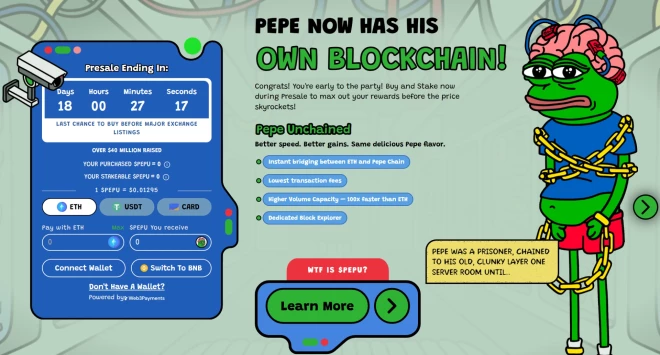 Pepe Unchained ($PEPU) nav tikai vēl viens Pepe klons - tā ir pārveidota, jaunas paaudzes mēmu monēta. Pateicoties 2. līmeņa blokķēdes tehnoloģijai, $PEPU piedāvā nepārspējamu ātrumu, drošību un zemas komisijas maksas, kas to padara par unikālu piedāvājumu mēmu monētu jomā.