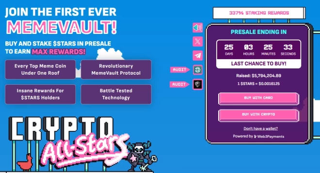 Crypto All-Stars ($STARS) ar savu inovatīvo platformu MemeVault veic revolūciju mēmu monētu jomā. Šis ieguldīšanas protokols ļauj lietotājiem glabāt populāras mēmu monētas un pretī nopelnīt $STARS žetonus. Izveidojot pirmo vienoto ''staking' 'sistēmu mēmu monētām, Crypto All-Stars ir gatavs mainīt tirgus definīciju.