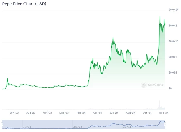 Tomēr vienīgais žetons, kas nav Doge vai Šiba Inu tematikas žetons, kas ir starp sešām labākajām mēmu monētām, $PEPE, strauji atpaliek. Pēc tam, kad novembrī tokens sasniedza savu visu laiku augstāko vērtību, trešā vērtīgākā mēmu monēta tagad ir vērtēta $0,00002087 apmērā.