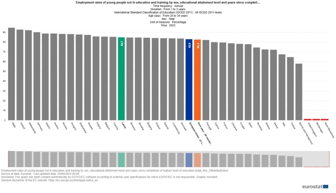 Pēc Eurostat datiem 2023. gadā ES 20-34 gadus vecu absolventu nodarbinātības līmenis bija 82,8 %, Latvijā - 84,7%*.