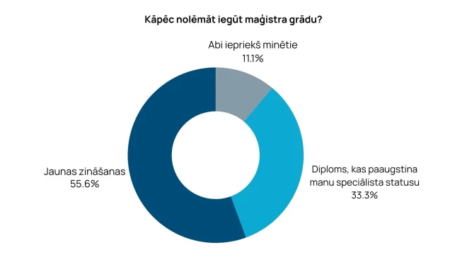 Iemesli, kāpēc būtu nepieciešams iegūt augstāko izglītību un studēt maģistrantūrā, katram var būt dažādi, taču TSI, Transporta un sakaru institūta maģistra studenti aptaujā uzsver, ka visvērtīgākais, ko var iegūt, ir zināšanas (55,6%). TSI informācijas sistēmu vadības maģistre Sanita Bringmane atzīst, ka studijas uzsāka, jo vēlējās papildināt un nostiprināt savas zināšanas, kā arī izaicināt sevi: “Izvēle par labu TSI noteica tas, ka es šeit atradu tieši tādu studiju programmu ar konkrētiem priekšmetiem, kādus vēlējos apgūt. Manuprāt, maģistrantūra ir loģisks turpinājums iegūto zināšanu nostiprināšanai tiem, kas nevēlas apstāties pie sasniegtā.”