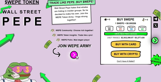 Kā WEPE armijas daļa turētāji iegūst iekšēju tirgus informāciju, augstākās kvalitātes tirdzniecības signālus un ekskluzīvus alfa zvanus. Šis lētais mēmu žetons izceļas ar to, ka apbalvo gudras stratēģijas, veicina iknedēļas tirdzniecības sacensības un piedāvā balvas par ieguldījumiem. Iepriekšpārdošanas laikā ieguldot $WEPE, jūs nostājaties kustības priekšplānā, kas apvieno jautrību, kopienu un peļņas potenciālu, vienlaicīgi izlīdzinot konkurences apstākļus ikdienas investoriem.