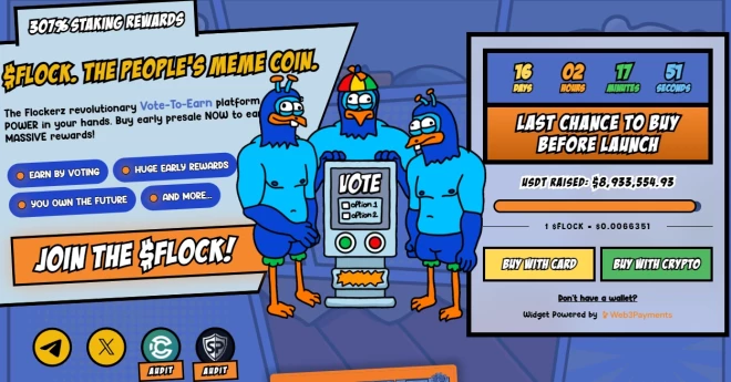 Inovatīvā “Vote-To-Earn” sistēma sadala lētus $FLOCK žetonus dalībniekiem, kuri iesaistās kopienas priekšlikumu izstrādē, tādējādi radot tiešu stimulu aktīvai sadarbībai. Tā kā 25 % žetonu ir paredzēti ieguldījumiem un papildu 20 % tiek piešķirti agrīnajiem investoriem iepriekšpārdošanas laikā, projekts veicina ilgtermiņa žetonu stabilitāti un spēcīgu kopienas lojalitāti. Pievēršoties nepieciešamībai pēc pārredzamības un decentralizētas kontroles, Flockerz ļauj dalībniekiem noteikt projekta virzību un veicināt tā izaugsmi.