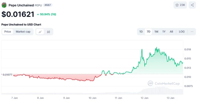 Nākamā monēta mūsu uzmanības centrā, kurai šomēnes tiek prognozēts 700% pieaugums, ir Pepe Unchained ($PEPU). Pagājušajā nedēļā vien $PEPU cena palielinājās par 50 %, strauji pieaugot no $0,01069 līdz $0,014 un signalizējot par potenciāli eksplozīvu tendenci. Iepriekš Pepe Unchained ieņēma virsrakstus, nodrošinot iespaidīgu 8x peļņu pēc tam, kad noslēdzās tā iepriekšpārdošana ar 74 miljonu ASV dolāru vērtību un žetons debitēja Uniswap.