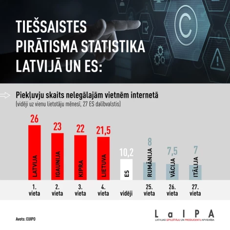 Ziņojums “Autortiesību pārkāpumi tiešsaistē 2023. gadā” liecina par ievērojamām atšķirībām starp dažādām ES dalībvalstīm. Antitopa “goda pjedestālu” ieņem Latvija, Igaunija un Kipra, bet Lietuva ir 4. vietā. Turklāt Latvija topa augšgalā ir ar ievērojamu atrāvienu, vairāk nekā divkārt pārsniedzot ES 27 valstu vidējo rādītāju. ES vidēji uz vienu interneta lietotāju ir 10,2 piekļuves nelegālam saturam mēnesī, kamēr Latvijā šis rādītājs ir 26, bet otrajā “vietā” esošajai Igaunijai – 23.