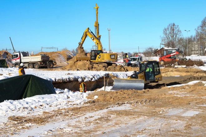 Darbi būvlaukumā norit pēc plāna. Jau nākamnedēļ, paliekot siltākiem laikapstākļiem, plānots atsākt pāļu urbšanu – kopumā teritorijā nepieciešams ieurbt vairāk nekā 240 pāļus.