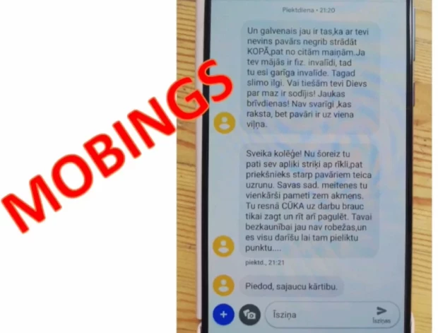 Mobings un bosings ir psihoemocionālā terora formas, kas diemžēl ir izplatītas arī Latvijā. Tiesībsarga biroja Sociālo, ekonomisko un kultūras tiesību nodaļas juridiskā padomniece Elīna Ūsiņa dalās ar trim reāliem un gana šokējošiem Latvijas piemēriem.