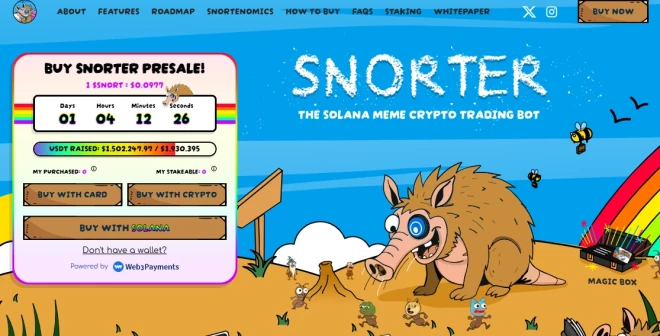 Tikmēr Snorter Token izceļas kā jauna, inovatīva tirdzniecības platforma, kas darbojas ar Telegram botu, piedāvājot ātru, drošu tirdzniecību ar zemu 0.85% komisijas maksu, MEV aizsardzību un 219% gada procentu ienesīgumu stakingā. Lai gan projekts ir agrīnā attīstības stadijā, tas jau piesaistījis ievērojamu investīciju summu un var kļūt par populāru risinājumu tirgotājiem, kas meklē ērtus un drošus tirdzniecības rīkus.